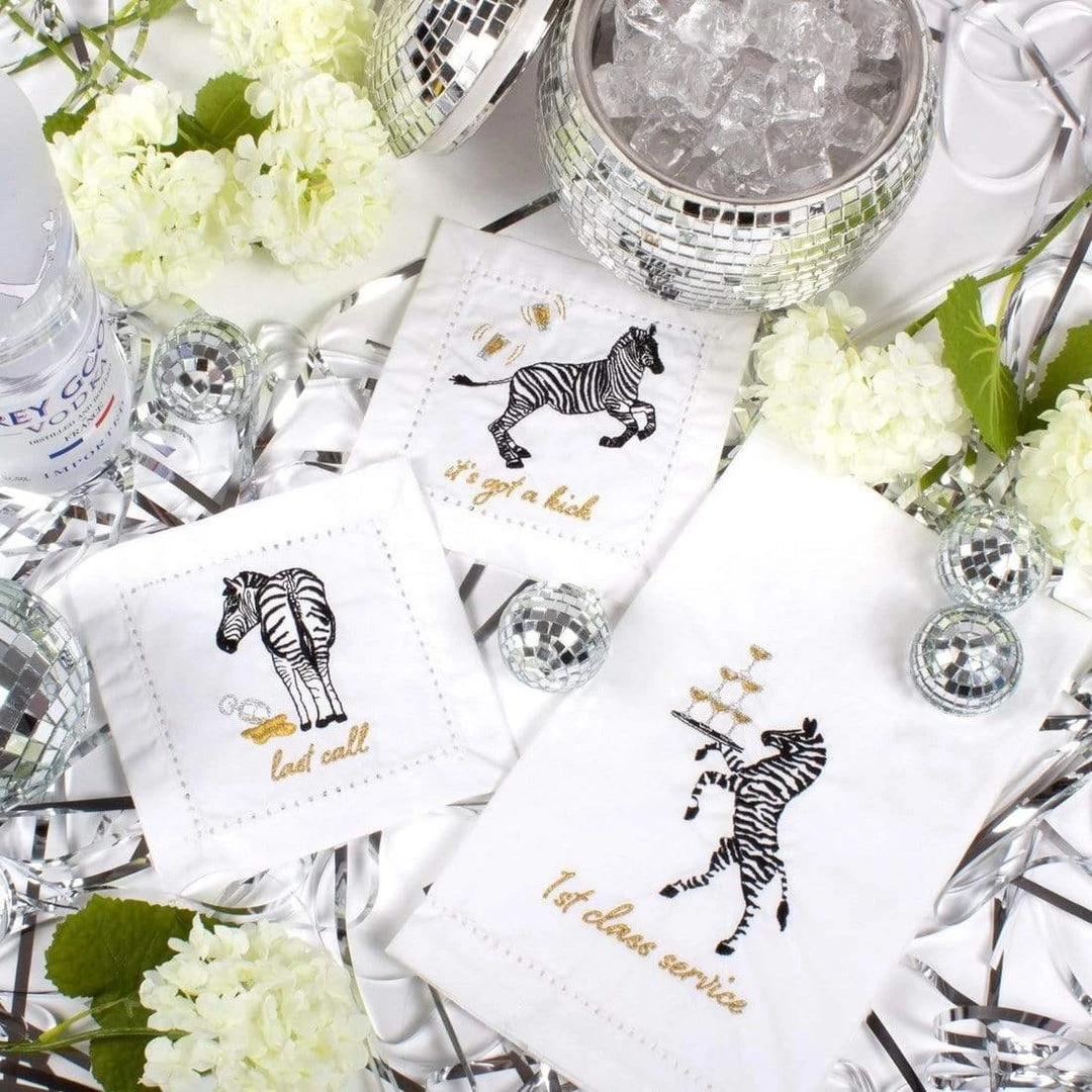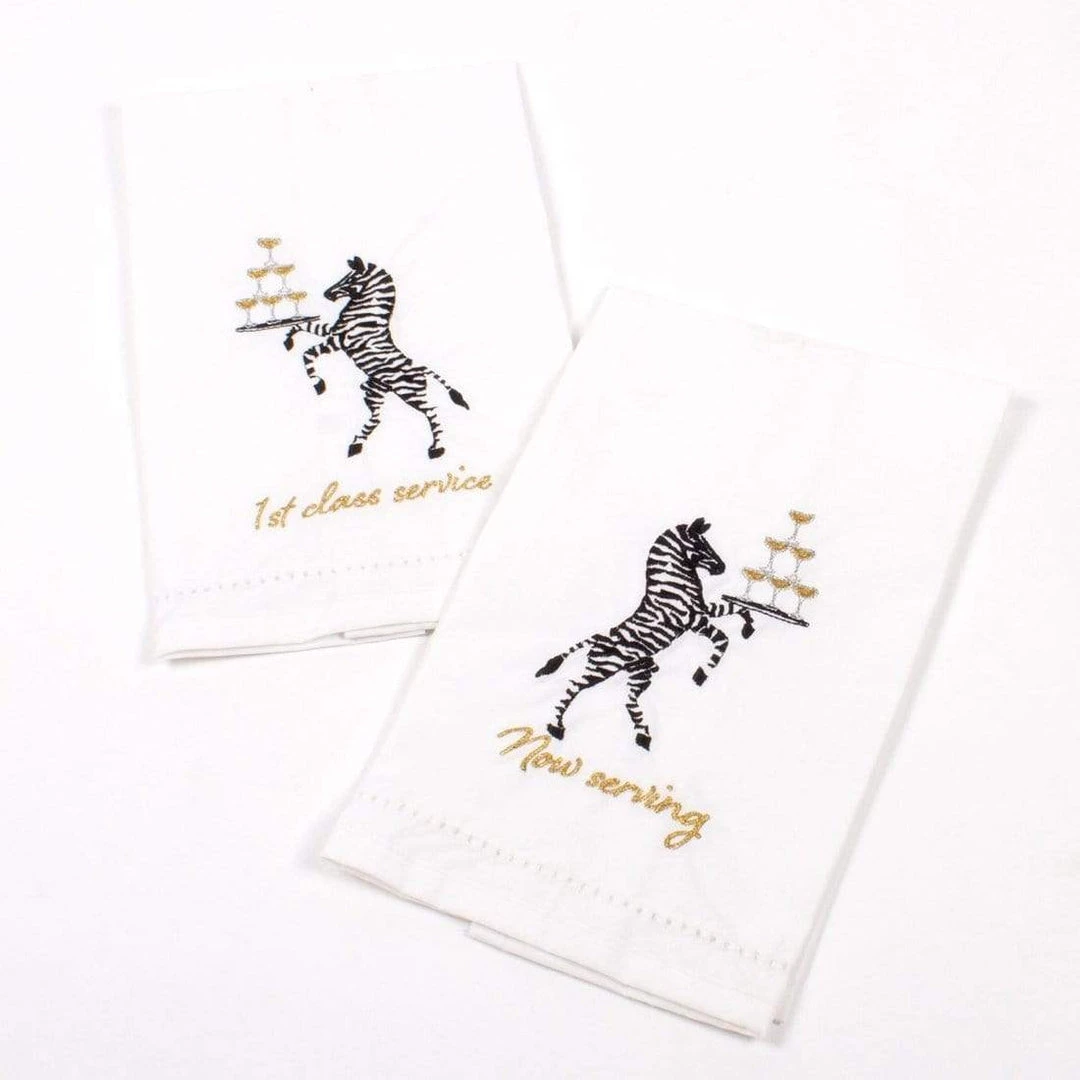 Glassware, decanters, bottle stoppers, and wine and spirits all sit together on the bar waiting for the festivities to begin but no bar collection is complete without the perfect bar towel that is eye catching and still functional. These zebra towels are the perfect way to spice up a bar!