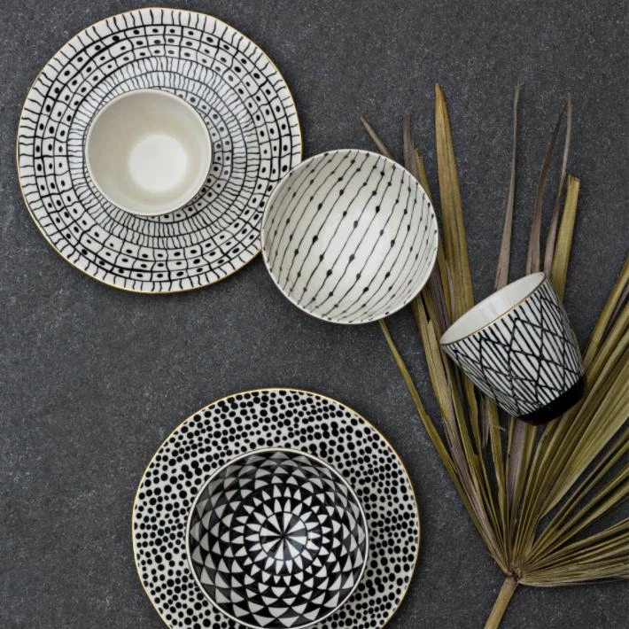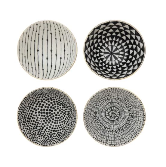Create a bold and fun decor in your kitchen with these individually decorated bowls. They have varying designs and contrast between black and white. One has spots, another lines and spots and another has triangles.