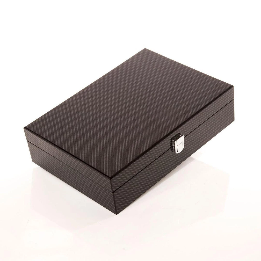 A classic game in a contemporary case. This poker box comes in a custom full carbon fiber case and is designed to add more play to your game. Complete with 4 color chips, 50 pieces of each chip color, 4 dice, and 2 decks of cards. Case features a beautiful black velvet lining within.