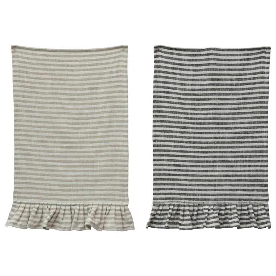 Add this set of striped cotton tea towels with ruffles to your kitchen decor. They look amazing hung over a cabinet handle for wiping hands. They are also ideal for lining a bread basket or tying around your waist for a quick apron. The wonderful perk a tea towel gives is that it wipes glasses dry without leaving a mountain of lint behind. Every successful kitchen needs a beautiful set of tea towels.