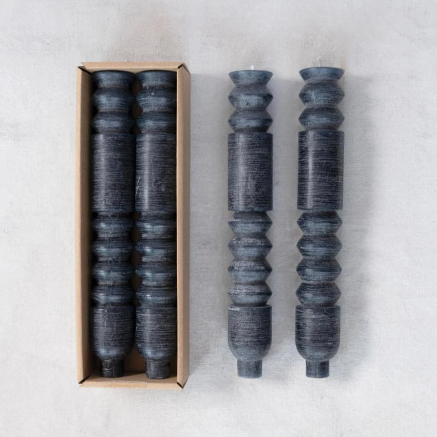 This listing is for two, 10 inch, unscented, carved taper candles with a powder finish in a moody slate color.