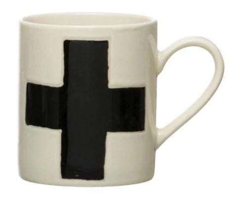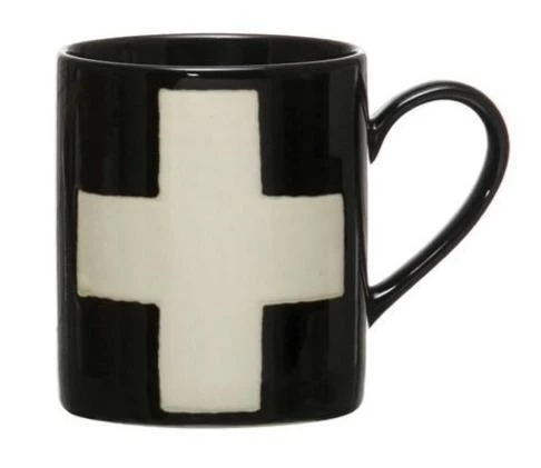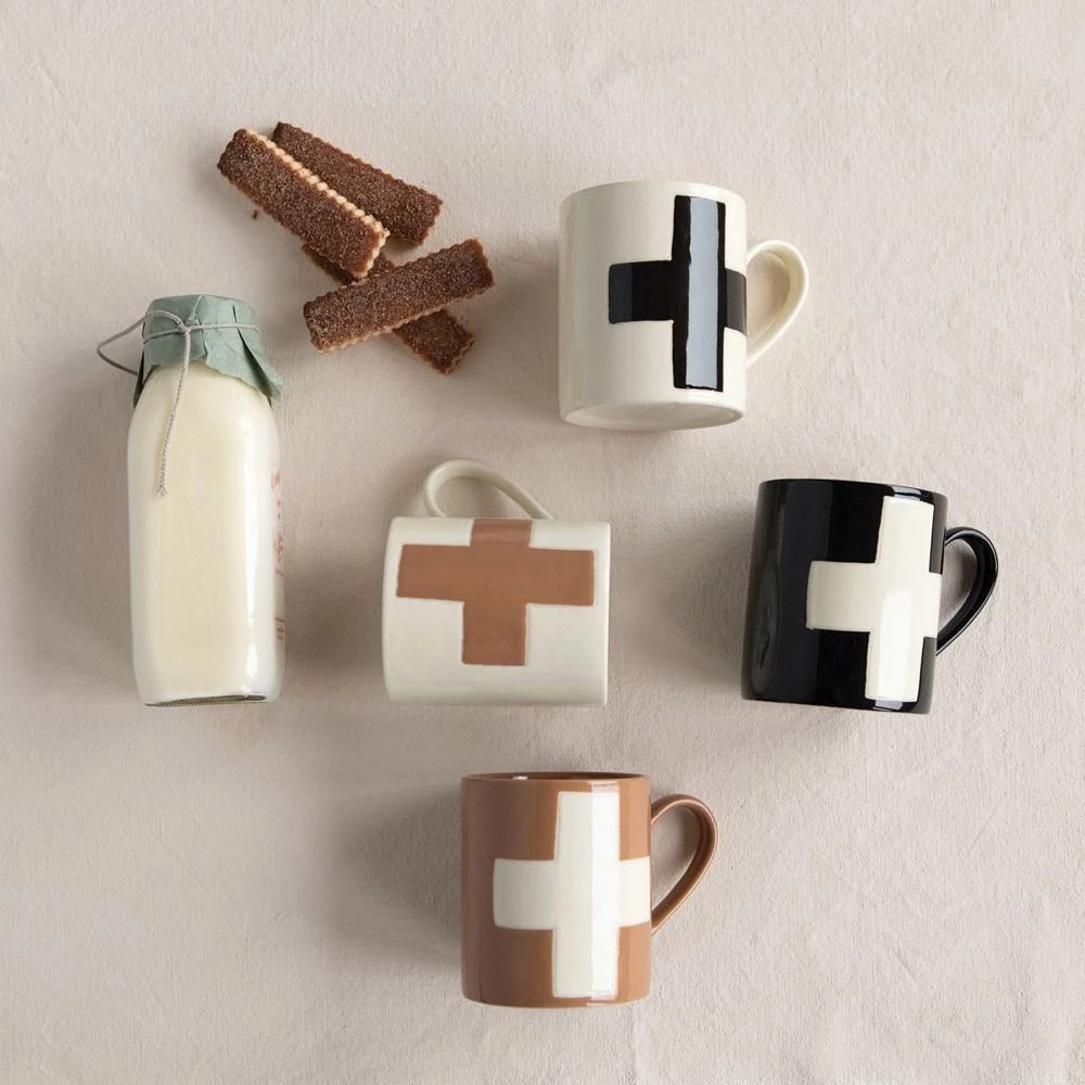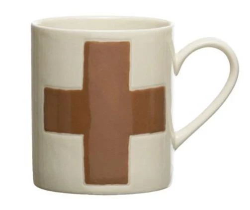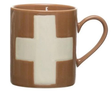 These handmade stoneware mugs feature a swiss cross made through wax relief. Each unique and one of a kind, with a gloss finish. Available in 4 colors.