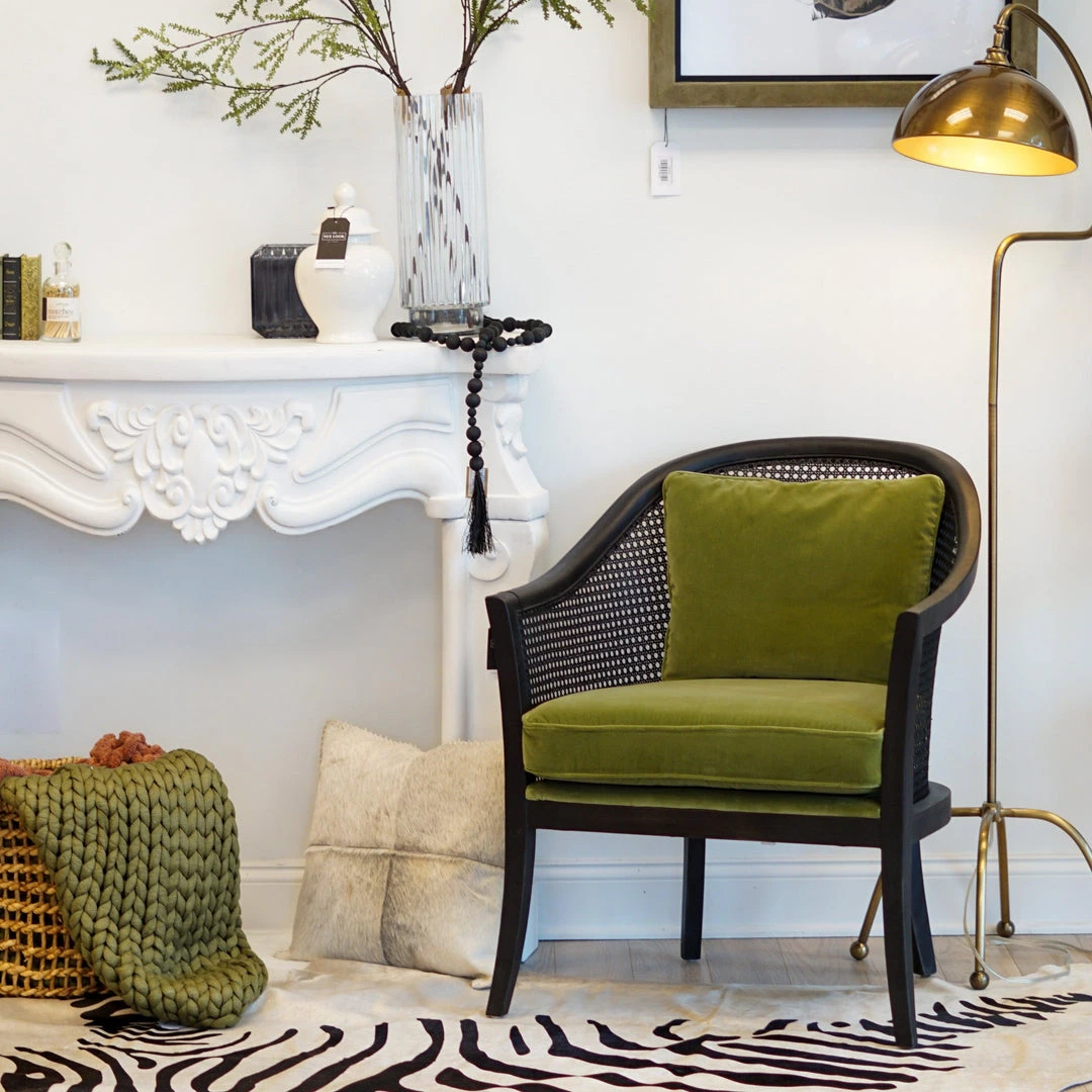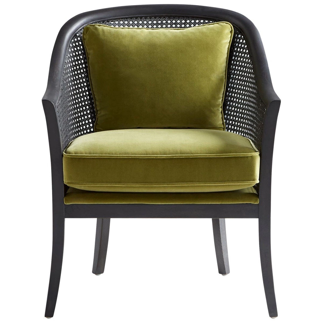 Complete the look of your living room or den whilst adding a new level of comfort, with this beautiful cane chair. Perfectly at home in a modern or transitional setting, the frame of this piece is crafted from solid wood in a soft black finish, and upholstered in a velvet olive hue on a foam seat. It features a removable cushioned back and flared arms. This is a classic silhouette which will stand the test of time throughout many years and design styles.