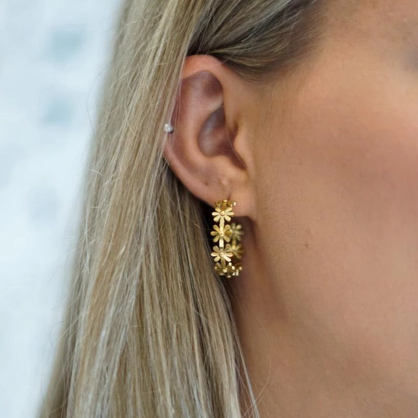 Nature-inspired accents are always on trend and these daisy flower hoop earrings are no exception. Capture the essence of nature beautifully with the petite, gold-plated petals and delicate style.