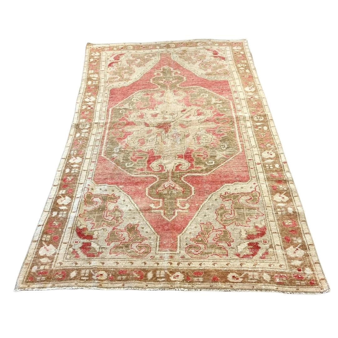 This one-of-a-kind vintage rug is hand-knotted and handwoven in Turkey from a unique wool blend. Made by skilled artisans with very fine quality handspun wool. Professionally cleaned and ready for delivery.