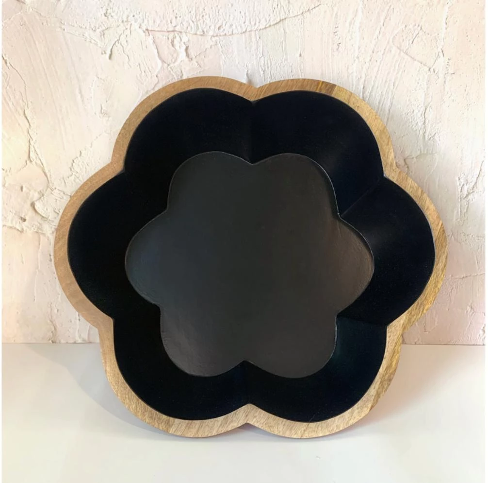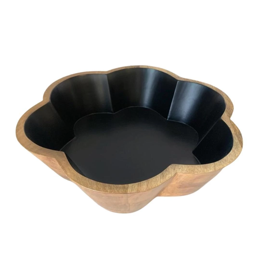 This flower shaped bowl is hand crafted out of mango wood and finished with a matte black lacquer. Use as an accent on a coffee table, as a fruit bowl or displayed upright on a shelf.