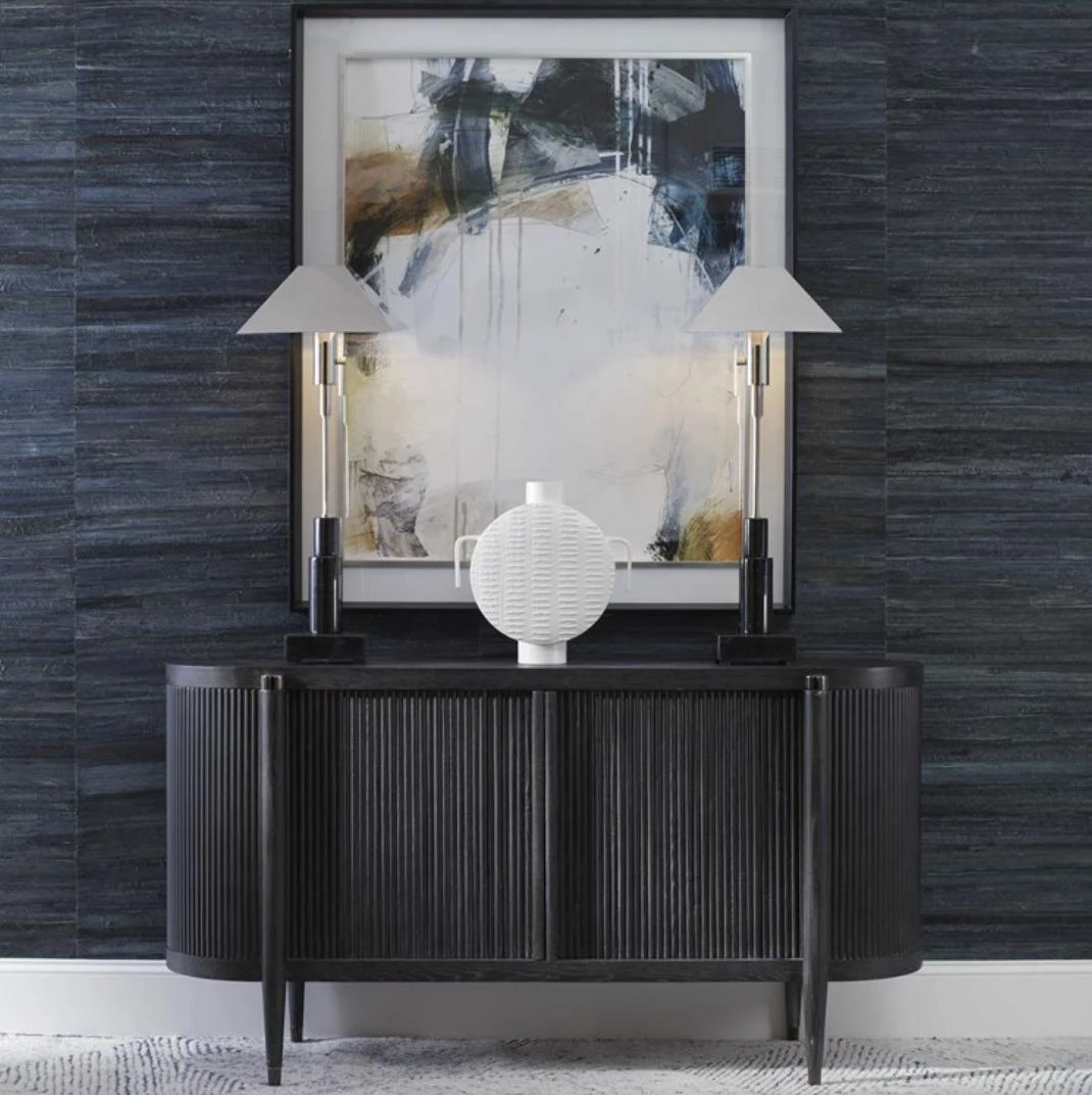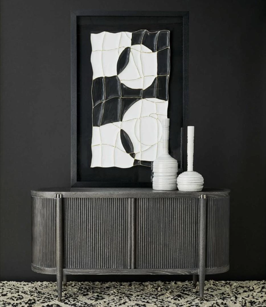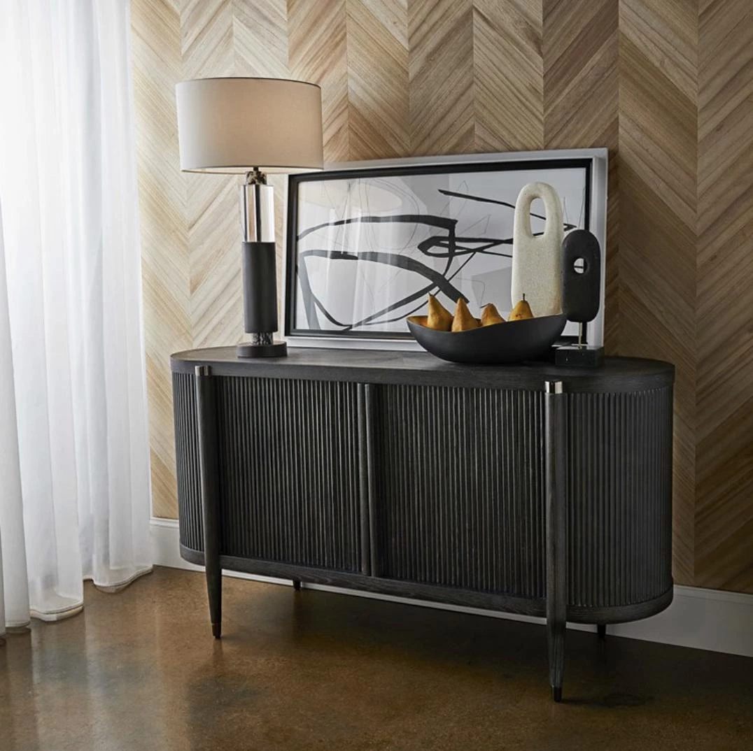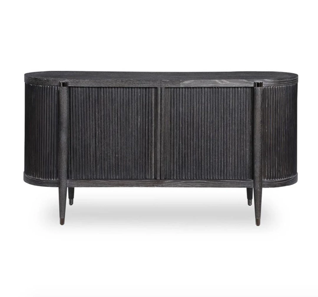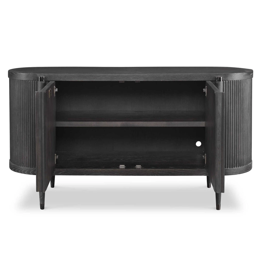 Made of American white oak and solid poplar wood with a black cerused finish. The Tambour cabinet is clad with solid oak half round flutes with two center doors that swing open and are shut with magnetic closures. This cabinet is accented with polished black nickel metal caps. The perfect accent piece for any room or for electronic storage under a TV, with one interior adjustable shelf.