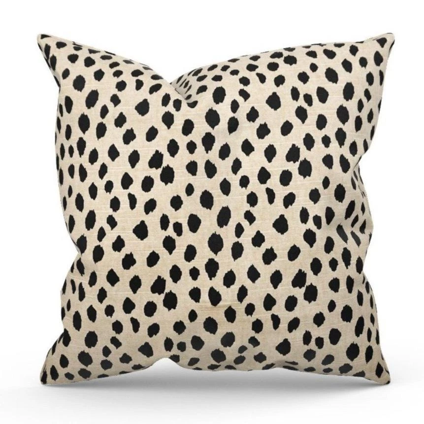 Our Dotty Pillow Cover is a more playful take on animal print! This fabric is a light canvas, with a tan and black contrasting pattern. Finished with an invisible zipper for easy insert and removal.