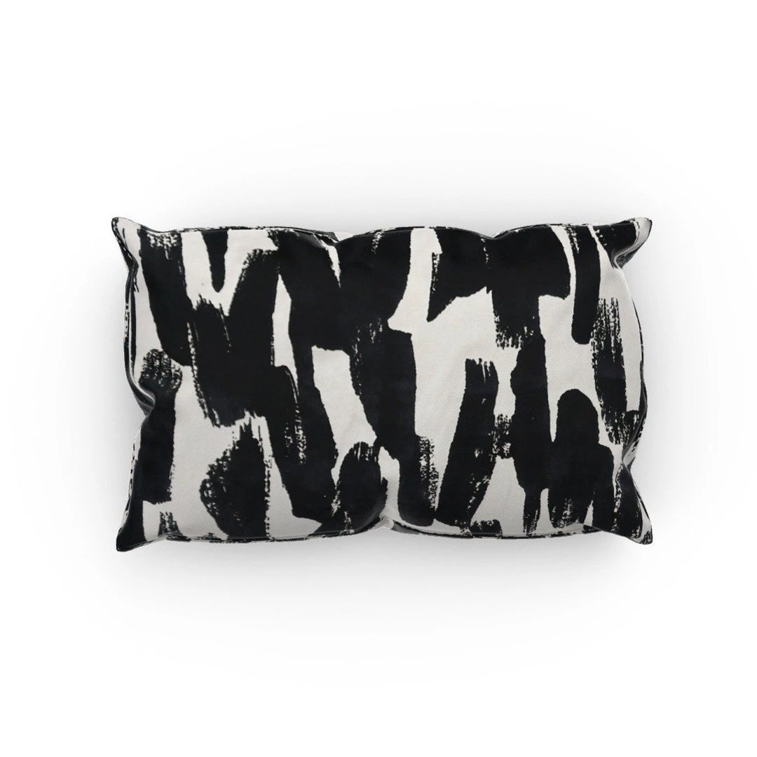 Our exclusive Domino Pillow Cover is the perfect modern touch to your home. This fabric screams quality, featuring an off-white thick upholstery canvas with touches of deep black raised velvet brush strokes. Finished with an invisible zipper for easy insert and removal.