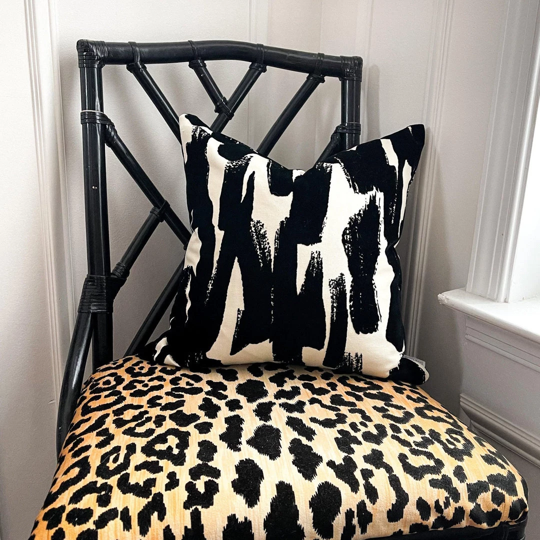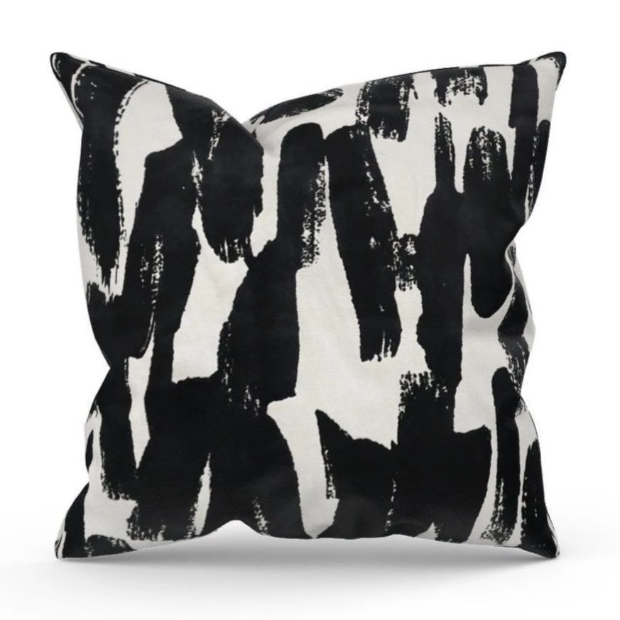 Our exclusive Domino Pillow Cover is the perfect modern touch to your home. This fabric screams quality, featuring an off-white thick upholstery canvas with touches of deep black raised velvet brush strokes. Finished with an invisible zipper for easy insert and removal.