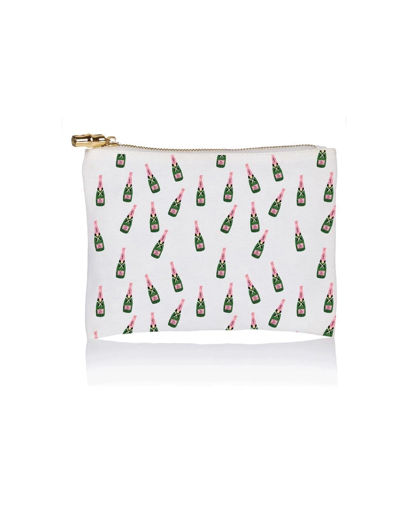 This flat zip pouch features an adorable print filled with pink and green champagne bottles… What’s not to love? Finished with a gold zipper and gold bamboo zipper pull.