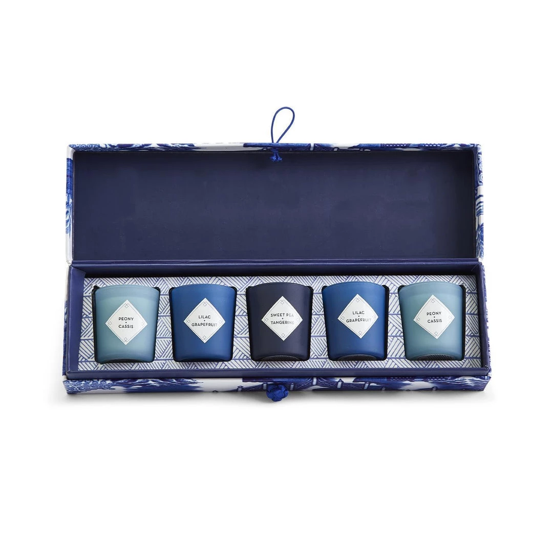 This blue & white chinoiserie candle set is the perfect gift for someone on your list! The outside of this box has a beautiful blue & white motif with a frog button closure. The inside reveals 5 soy candles in matte glass votives in three different scents.