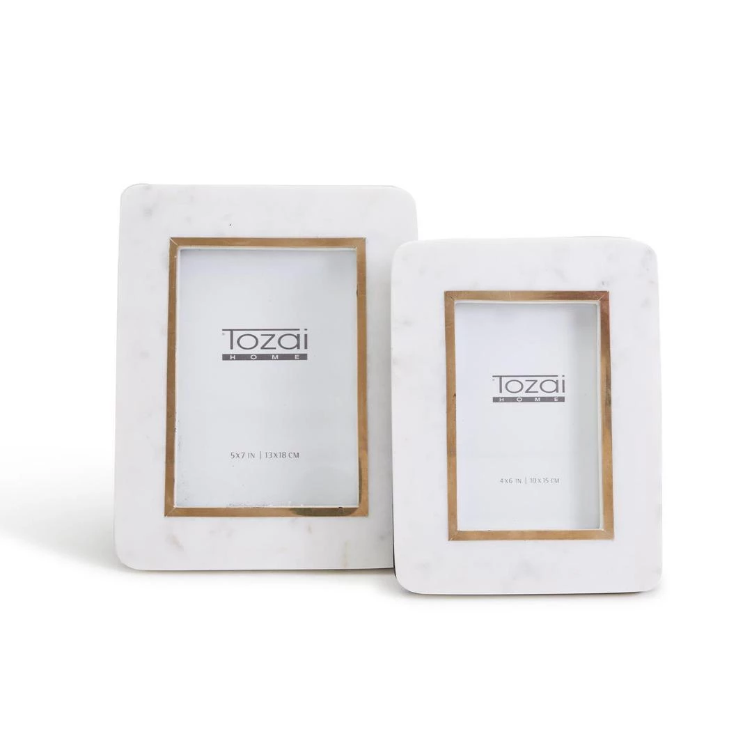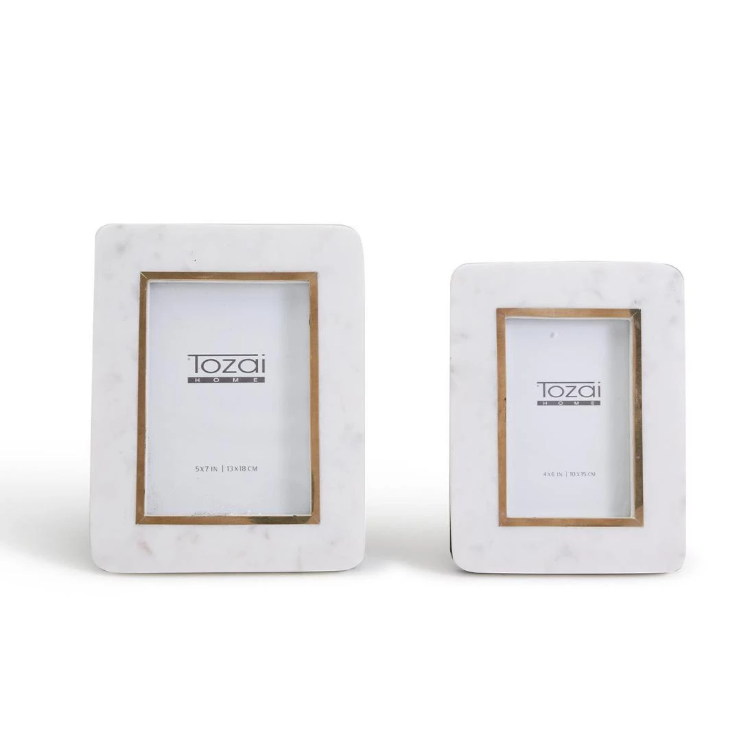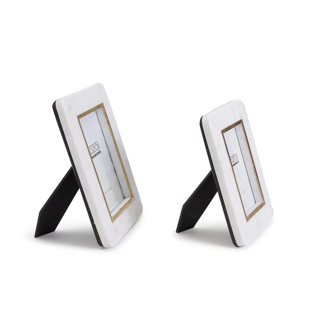 These fine picture frames feature a natural, smooth marble finish and gold band to bring timeless charm to your living room decor. Add a pop of neutral flair with minimalistic design on your console table, nightstand, or any other surface to add a personal touch to your interior decorating.