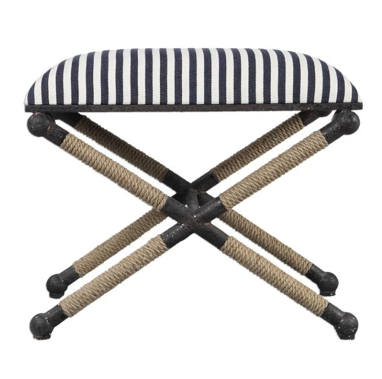 Rustic iron frame with a nautical touch, wrapped in natural fiber rope accents. Cushioned top is a sturdy, sailor-striped cotton in crisp navy and cream.