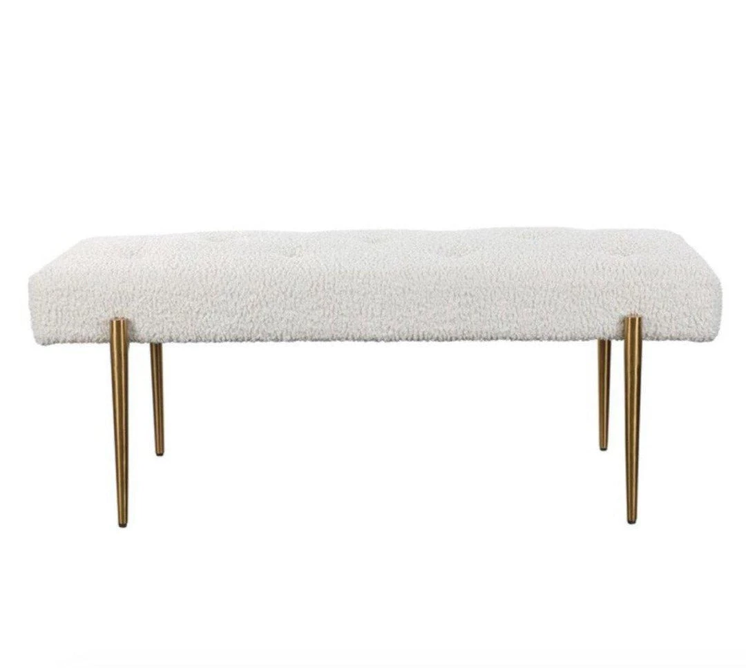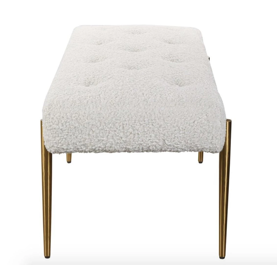 Expertly tailored in white faux shearling, this glamorous accent bench features a plush button tufted seat, atop four tapered stainless steel legs finished in antique brushed brass.
