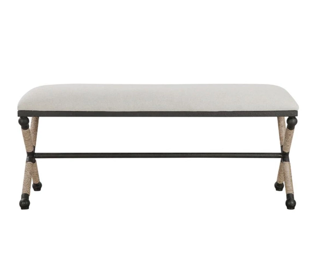 Rustic iron frame with a nautical touch, wrapped in natural fiber rope accents. Cushioned top is a sturdy, cotton in a neutral oatmeal.